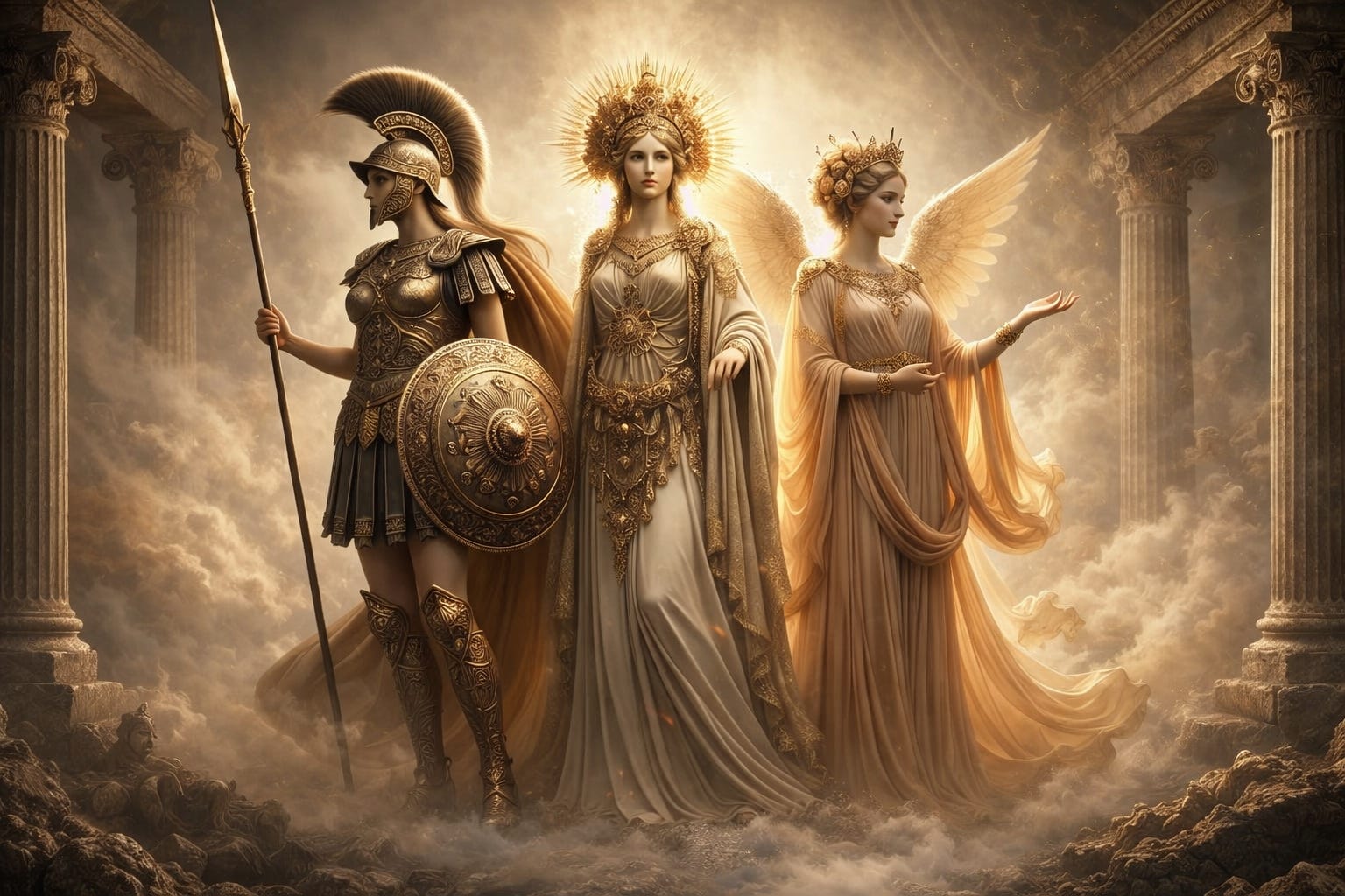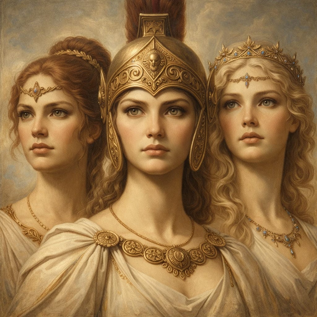 Athena, Hera, and Aphrodite stand at the clearing of Being as embodiments of wisdom, majesty, and divine love in their primordial form ‘in time.’ They belong ‘in time’ to the world before calculative metaphysics, to the pre-Socratic reality where Being was still experienced as something unconcealed, rather than something analyzed, categorized, or systematized. They are not mere subjective objects of our imagination, nor, conversely, are they ‘entities’ in the world. They are poetic, artistic heralds of wisdom, majesty, and divine love yearning for fulfillment in Jesus Christ and the Catholic Church. Athena, Hera, and Aphrodite stand as shimmering echoes in the liminal space where the created reaches for the uncreated in the language of embodied, poetic expression.
