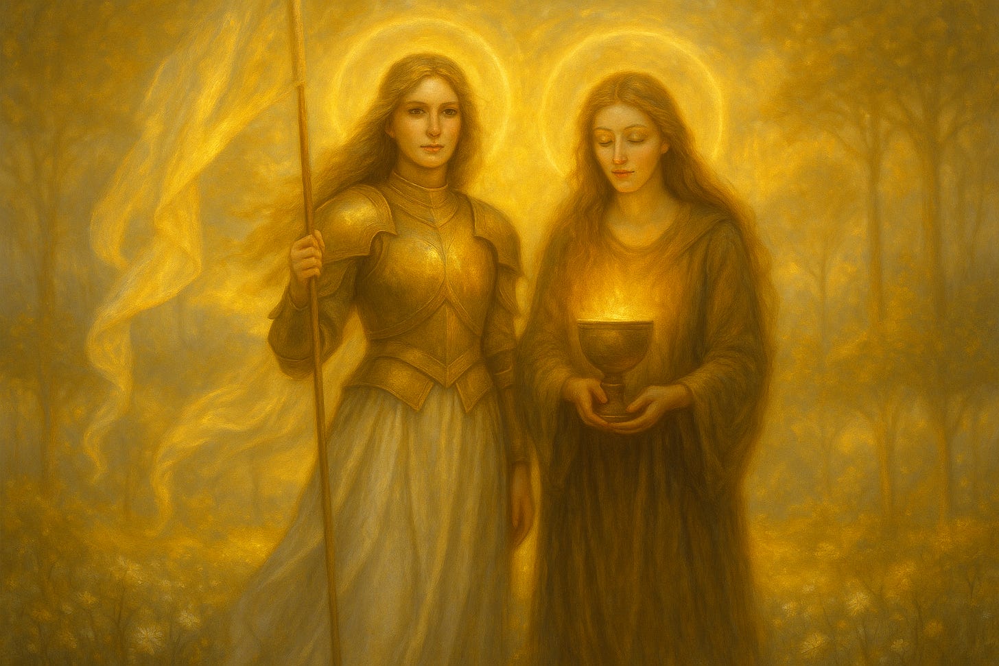 Caelia and Mirelda: The Book of Thresholds is a contemplative companion to The Sky-Veil—a series of symbolic veils rather than chapters, where Caelia bears the silent banner and Mirelda holds the glowing chalice. These are not steps in a journey, but moments of return.