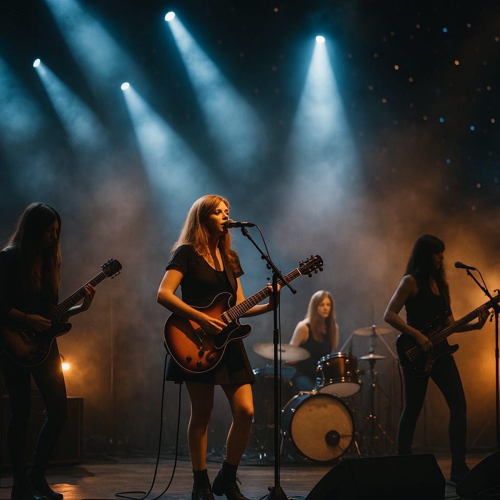 Aphrodite on lead vocals and guitar, Athena on rhythm and keyboards, Hera on bass, and Caelia behind the drums — together they summoned a storm of light and sound that set the amphitheater ablaze with awe.
