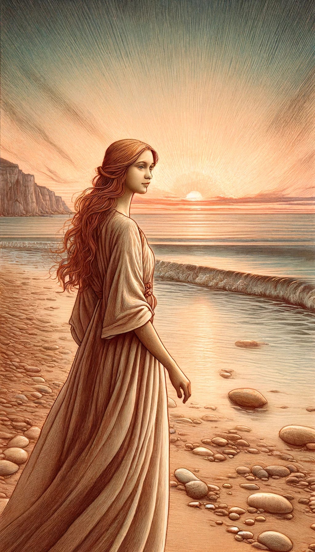 Dawn is the image of inceptuality—rising from night, bearing the first trace of light. She heralds the day without becoming it. She stands in the seam between worlds, the luminous interval where seeing begins.