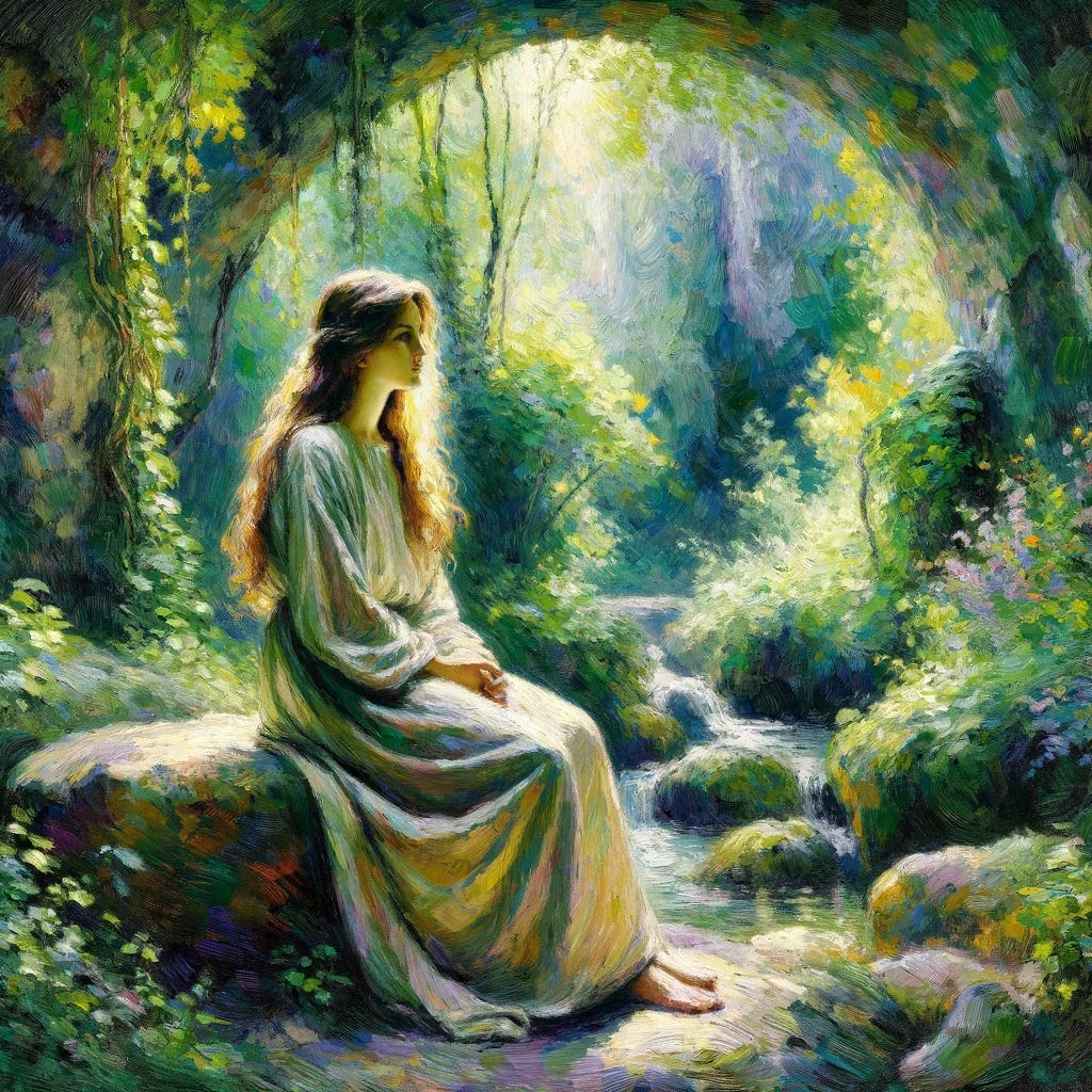 In her radiance, Mirelda is the Being of that land, gathered at the center of the Deep Heart beneath the Queen Beyond the Veil. She is threshold and dawn at once—the primordial nearness that precedes full unconcealment. Through her abiding fidelity, the converging flame of Caelia is illumined by the same silent light that first rested upon the far shores. From that stillness, a way opens—a gentle ascent traced not by effort, but by reception—upon which the soul begins to rise.