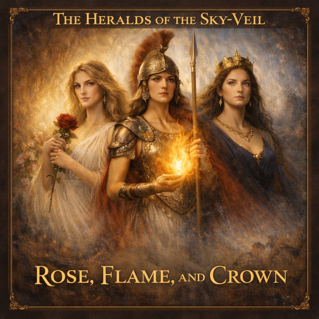 The lyrics of Rose, Flame, and Crown unfold the inner architecture of the Sky-Veil: the pilgrim’s passage through Beauty, Wisdom, and Majesty—not as ideas, but as lived encounters.