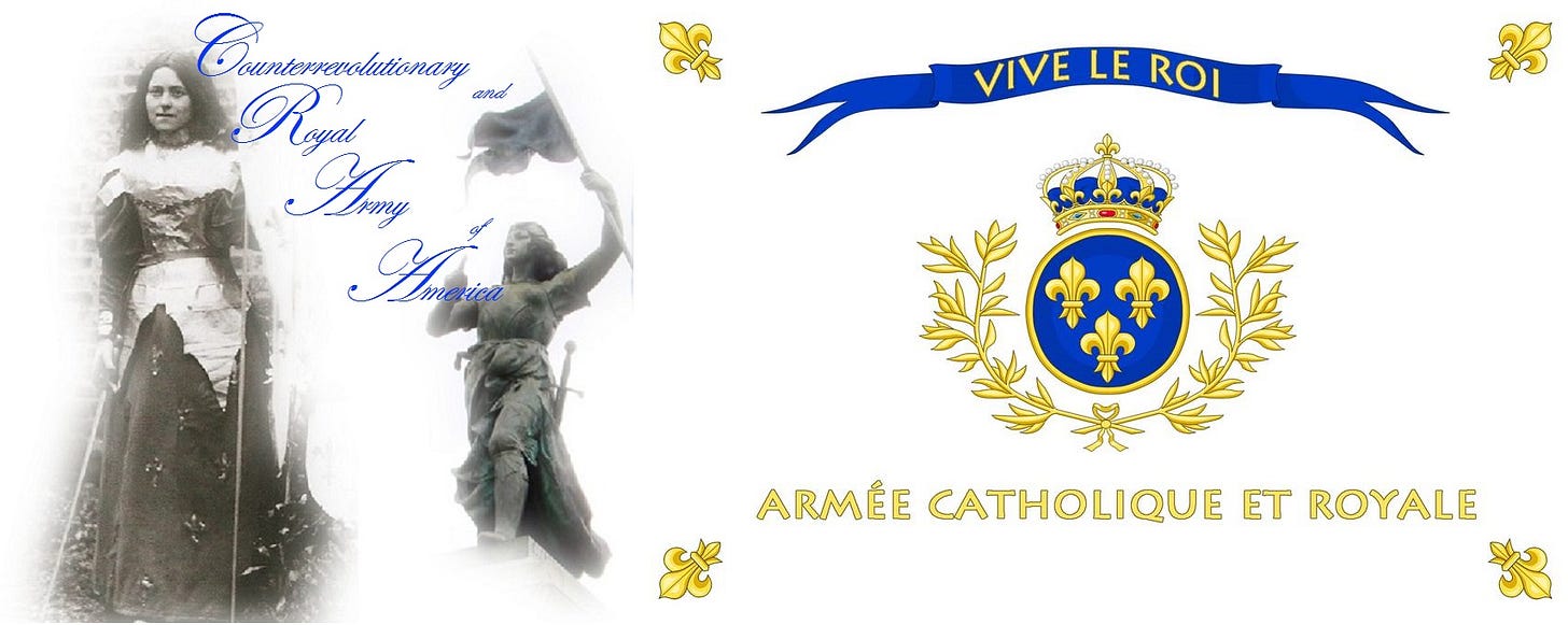 Catholic and Royal France in our hearts is by necessity counterrevolutionary. We are obedient to the bimodal phenomena of the hearts of St. Joan and St. Thérèse. This requires the rejection of modernity’s revolutionary philosophies, spiritualities, and institutions. The counterrevolution is necessary that we might clear the rubble of the Protestant Revolution and the Enlightenment from the path of the Dogmatic Creed before us leading to the Kingdom of God.