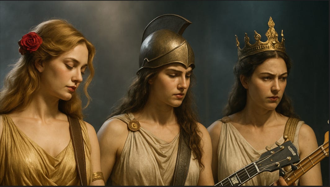 But have you noticed? Something remarkable has happened. Within the Sky-Veil, three ancient goddesses—Aphrodite, Athena, and Hera—have crossed the threshold of myth and become the Heralds of Being. What was once carved in marble now sings through amplifiers and electric strings. You can’t just wander into any world and find immortal heralds pounding out chord-flaming riffs before a dancing, shimmering crowd. Only here—beneath the luminous canopy of the Sky-Veil.