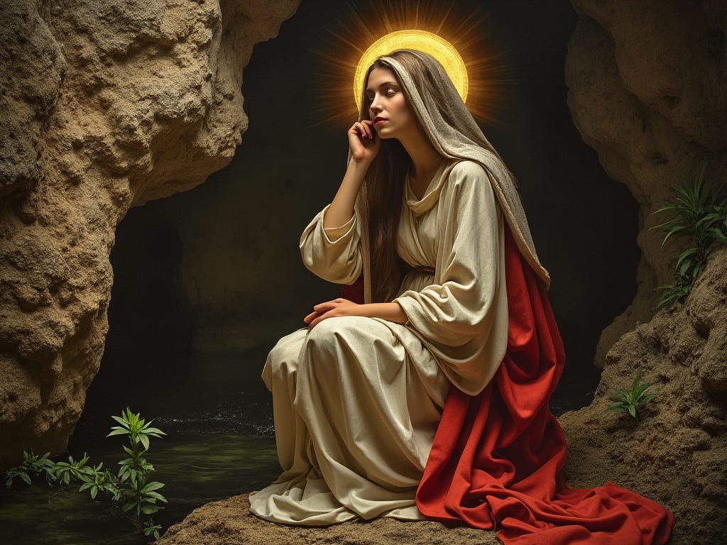 Her story unveils the hidden architecture of Our Lady’s Mystical France within our hearts. In union with Joan and Thérèse, she brings forth an expression of divine truth, beauty, and goodness. Through her intimate love for Jesus and Mary, the Magdalene intercedes on our behalf, transforming the confusion of spiritual possibilities in our souls into a radiant line of insight. This discovery of Holy Expression—a grace of clarity and participation—is a gift from the Holy Trinity bestowed through her maternal care beneath the Queenship of Mary.