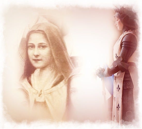 I think they do this through their combined spirituality, which I refer to in my tagline, "St. Joan and St. Thérèse – together they are the most beautiful color in the world." That spiritual beauty is beyond description in earthly terms, for it is a heavenly color that originates in the Holy Spirit, shines forth through the Immaculate Heart of Mary, and then emanates out across the skyline of the Kingdom through the prism of these two saintly sisters. The equanimity that falls upon us like light rain in a peaceful meadow finds its source in both a Thérèsian desire to be unknown in the world as we climb mystical Mount Carmel with St. John of the Cross to the Interior Castle of St. Teresa of Avila on the one hand, and, on the other, a desire to actively engage the world with a radical Jehannian-like intensity and warrior-like Crusading spirit.