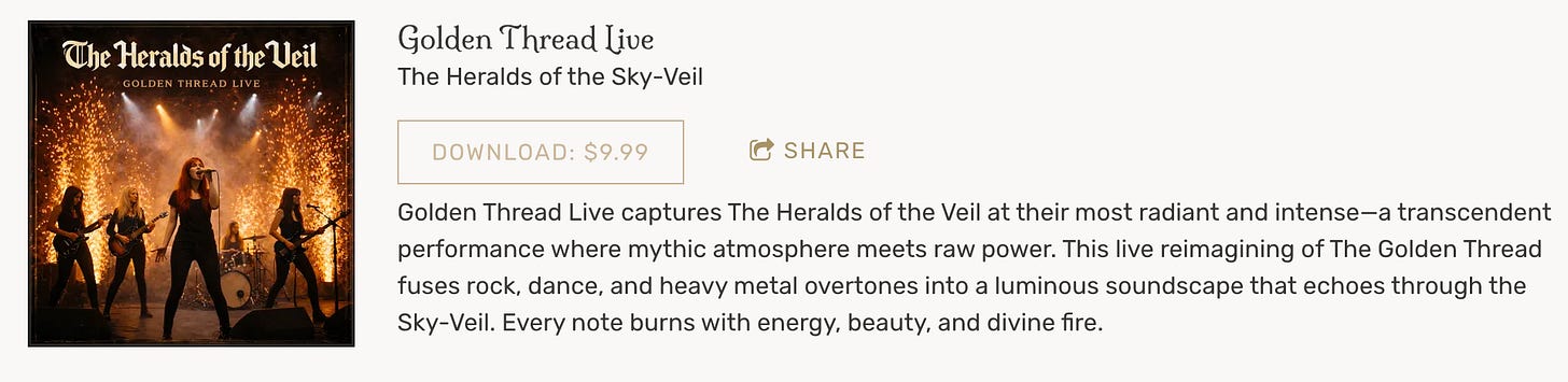 The response to The Golden Thread has been overwhelming beyond anything the Heralds imagined. Thousands of pilgrims have taken up the songs, followed the melodies, and felt the pull of that single, luminous thread woven through every movement and refrain. In gratitude—and in joy—The Heralds of the Veil now offer this full live performance as a gift.