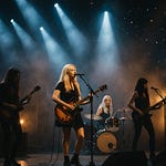 Behind her, Aphrodite and Athena stood in lockstep, unleashing heavy, driving riffs that rolled through the stone like lightning. Their guitars did not merely accompany the songs—they carved them into the night, filling the amphitheater with brilliance and force.