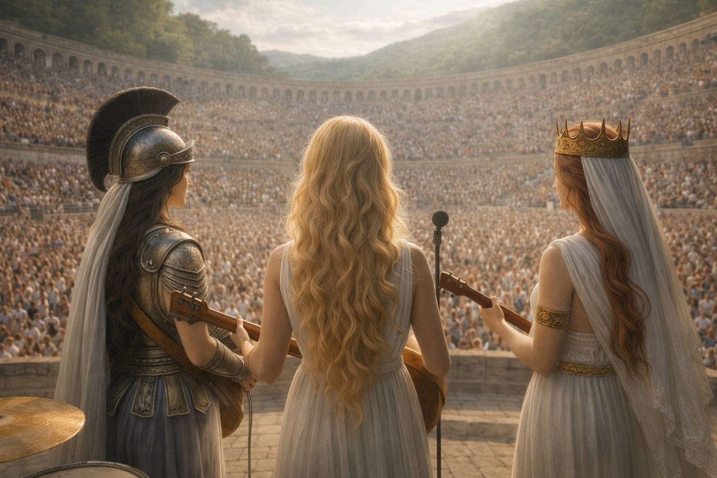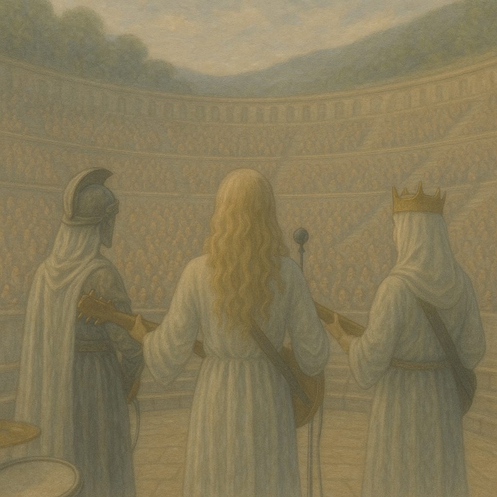 When Aphrodite struck the first chord, the amphitheater vibrated with a resonance that brought a glint to the golden thread running through the heavens. Hera’s bass thundered like the heartbeat of the hillside itself, and Athena’s chords cut clear and fierce, the edge of golden wisdom gleaming from the Sky-Veil itself. Together they shimmered, and their shimmering was made present by the mystery of Being in the nearness of the Veil.